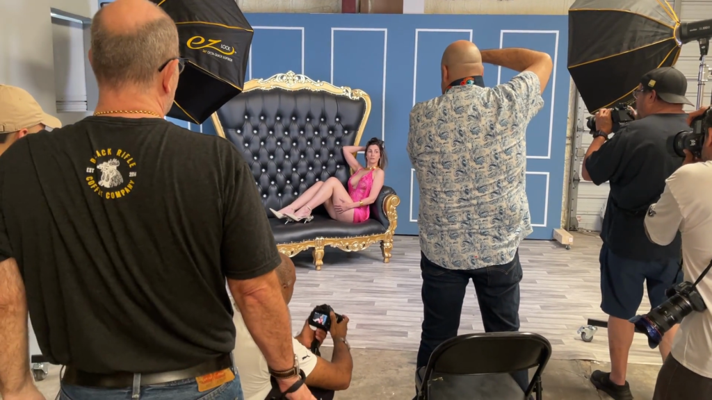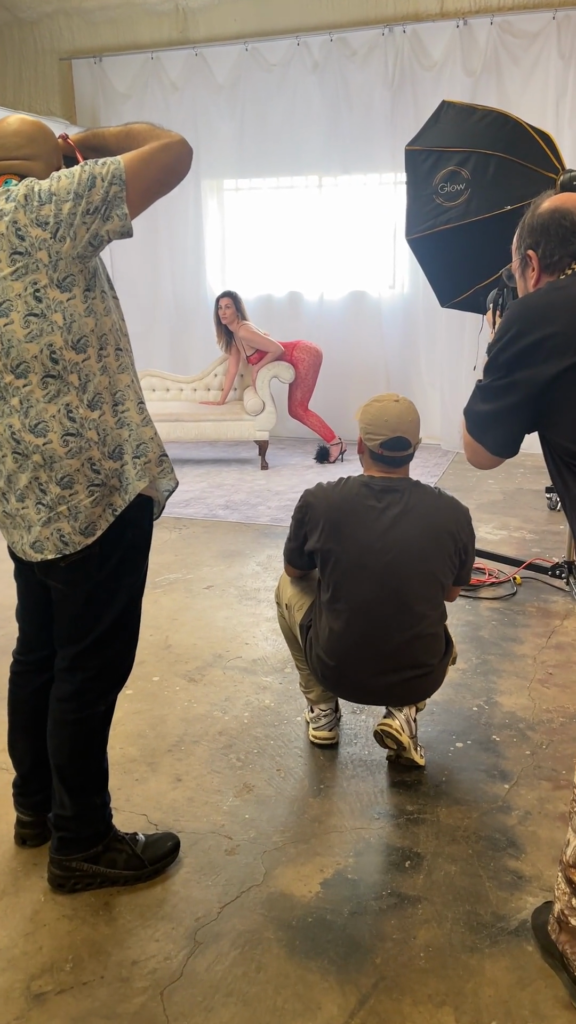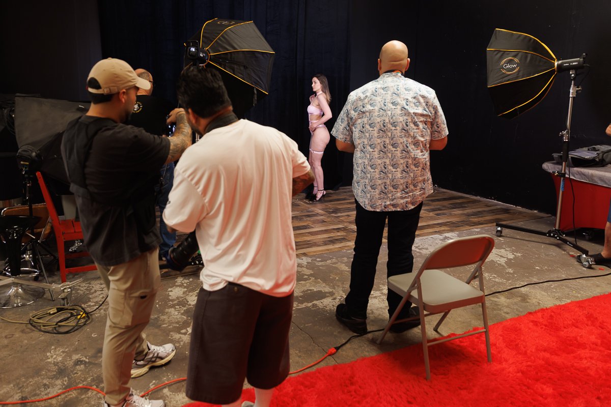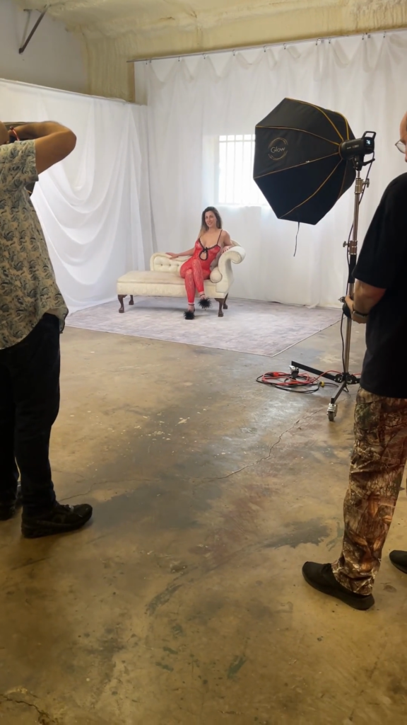 We moved through three different backgrounds, and Sidy was full-on badass from start to finish. We started off on that bright white setup with the cream chaise and that red lace look, then moved into the darker black backdrop stuff once things got more stripped down, and then finished things up on that black-and-gold throne against the blue wall panels. Each setup had its own thing going on, and every time the cameras came up, she was right there giving people exactly what they came for.